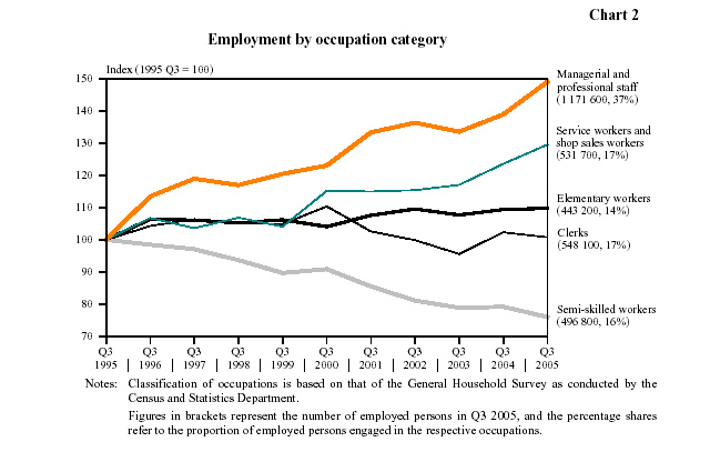 8. Hong Kong's economy has been restructuring itself to move up the value chain and has created many high-salaried jobs. In recent years, our workforce has grown at an average annual rate of 1 per cent, while the corresponding rate for the more highly-skilled, professional and managerial workforce is close to 4 per cent. Today, one in three of our working population belongs in this category. Due to the strong economic recovery, the supply of certain professionals is actually falling short of demand. The number of full-time employees with a monthly income of $15,000 or above has risen from 470 000 in 1995 to 790 000 in 2005. This represents an increase from 21 per cent to nearly one third of the total number of full-time employees. In contrast, the number of people earning less than $9,000 a month fell from 1.12 million to 930 000, which translates into a drop from almost 50 per cent to 38 per cent. The number of employees earning less than $5,000 a month last year was below 6 per cent.