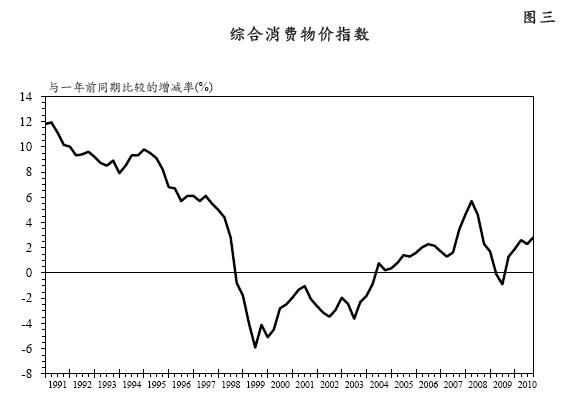 15. 经济强劲复苏,加上美元偏软和环球食品及商品价格上扬,本港通胀压力在年内逐步上升。以综合消费物价指数计算,二○一○年全年通胀率平均为百分之二点四。撇除政府一次性措施的影响,基本通胀率是百分之一点七。考虑到去年经济有百分之六点八的强劲扩张,全年通胀水平尚算温和。去年生产力持续显著改进,有效纾缓了部分物价上升的压力。